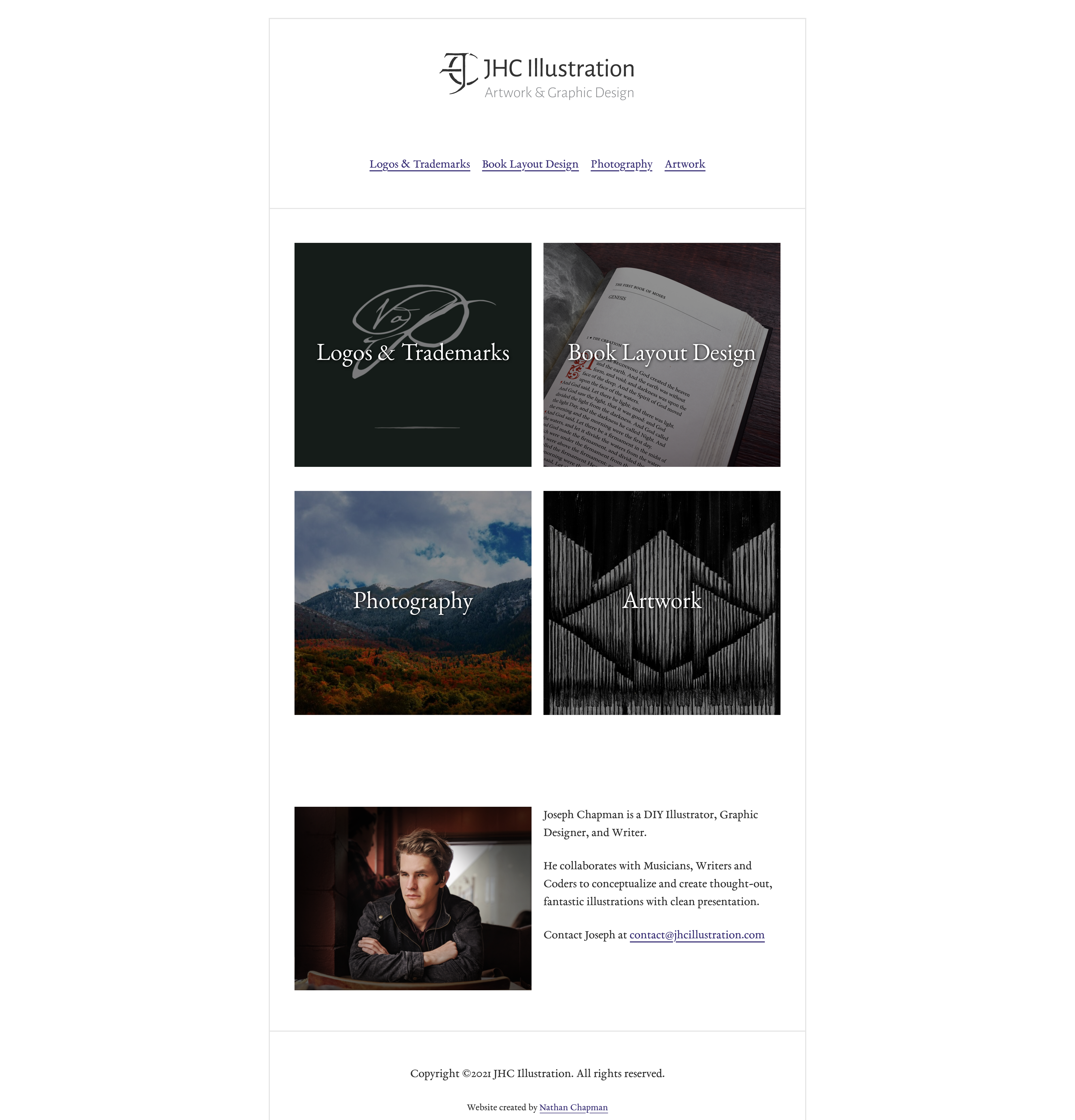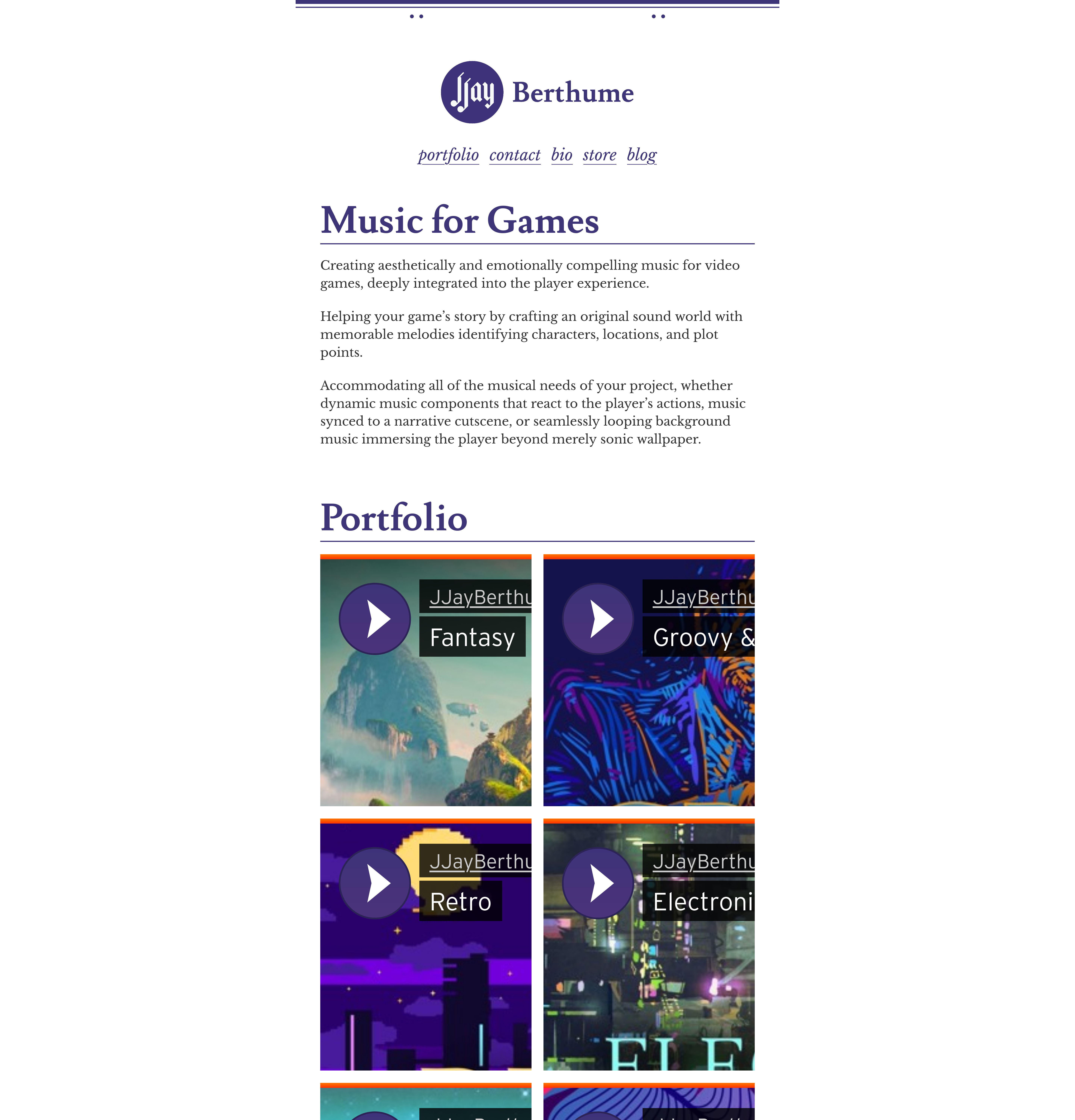 A portfolio website for the Composer JJay Berthume, which features embedded audio. Created with plain HTML and CSS.